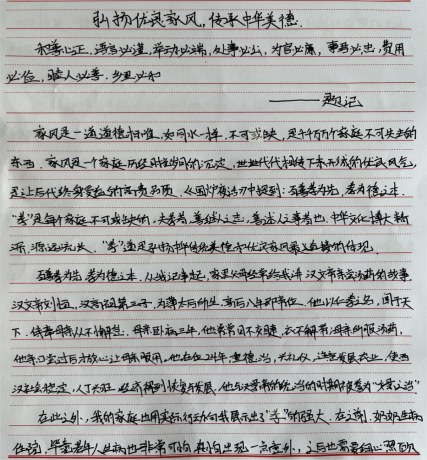 为深入学习贯彻习近平总书记关于家庭家教家风建设重要论述,进一步引导青年学生树立正确的世界观、人生观、价值观;倡导和培育清廉家风、传播清廉价值理念;为风清气正的校园氛围注入清廉力量,beat365平台官方网站党委和纪委暑假期间开展了“颂家训 传家风 倡清廉”新生的一封家书征集活动,通过亲子交流,萃取家训精华;笔墨书写,铭记清朗家风;畅谈廉洁故事,践行廉洁家风,充分挖掘学生身边的家风家训文化,引领和营造家风清朗的教育氛围。